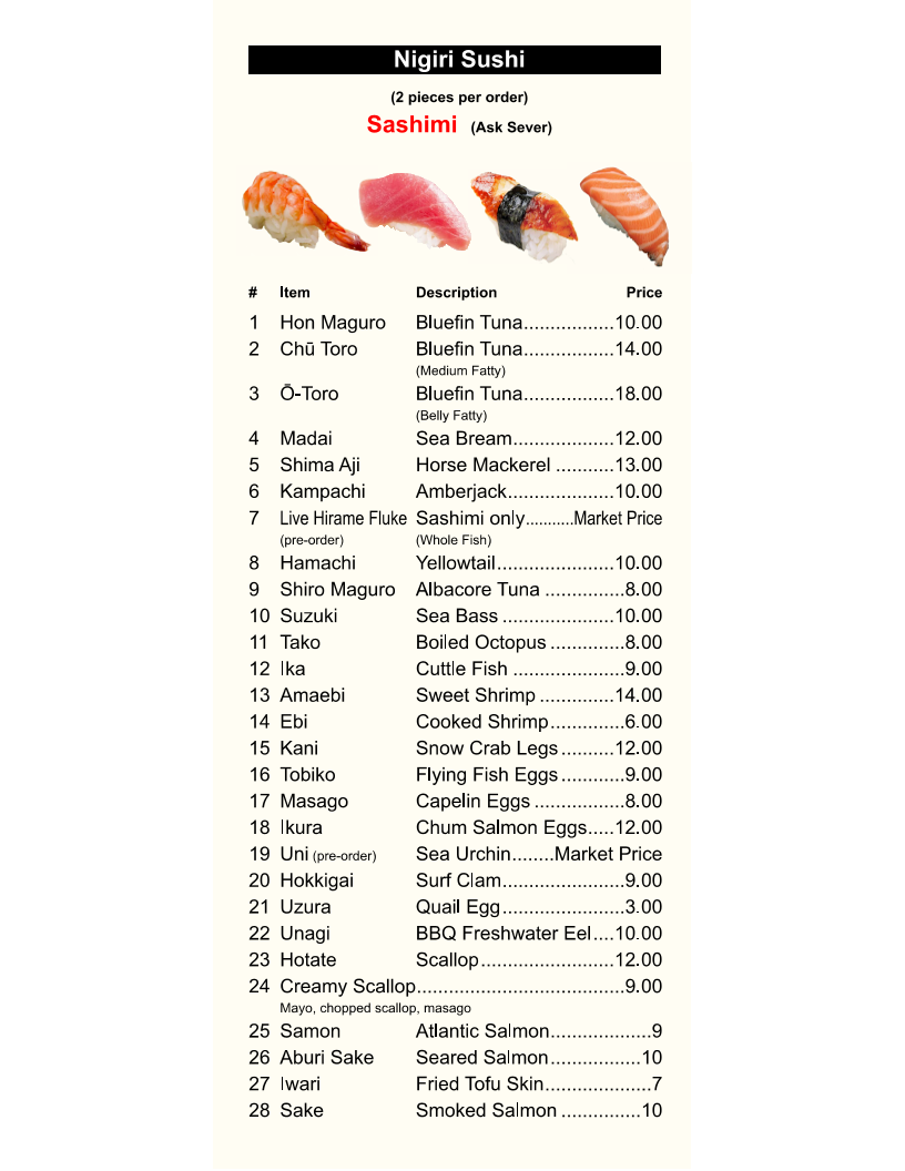 Sushi 4 Pic (Tuna, salmon, shrimp, red snapper) Comes with Rice, Salad, Gyoza, California Roll Contains raw or undercooked ingredients. Consuming raw or undercooked meats, poultry, seafood, shellfish, or eggs may increase your risk of foodborne illness. Please eat with discretion. Before placing your order, please inform your server if you have any food allergies.