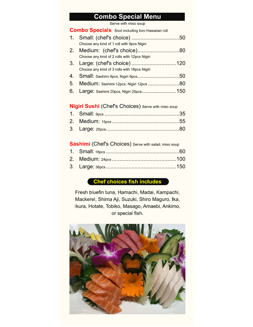 2 tuna, 2 salmon, 2 escolar Comes with Rice, Salad, Gyoza, California Roll Contains raw or undercooked ingredients. Consuming raw or undercooked meats, poultry, seafood, shellfish, or eggs may increase your risk of foodborne illness. Please eat with discretion. Before placing your order, please inform your server if you have any food allergies.