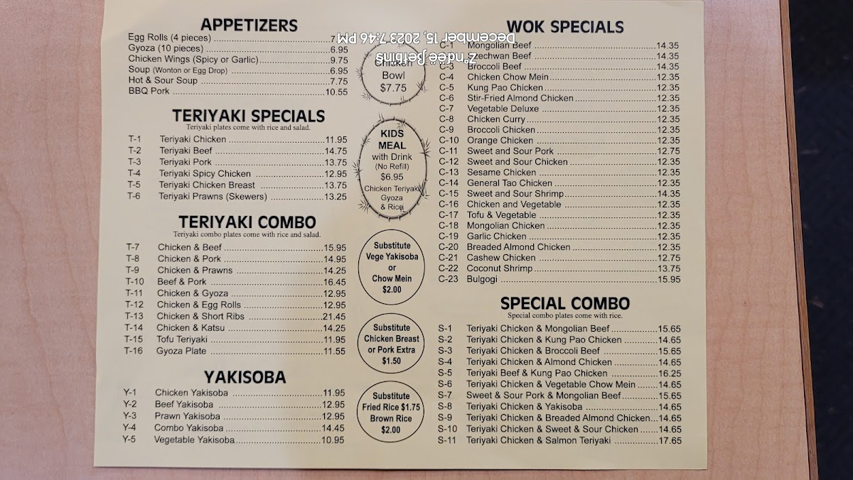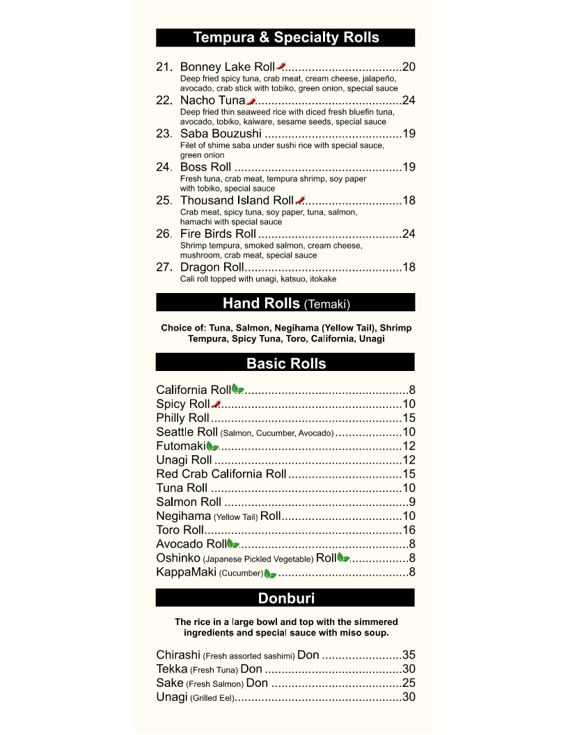 Teriyaki chicken, Mongolian beef, sweet & sour chicken, egg rolls (2), gyoza (5), steamed or fried rice, veggie yakisoba.
