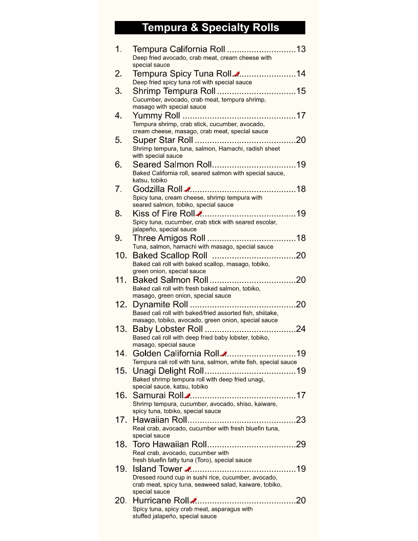 Cream cheese, cucumber, crabmeat,tempura shrimp, spicy tuna,avocado and crunchy flakes