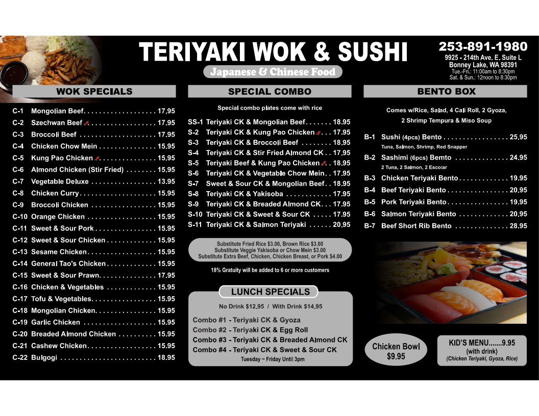 Teriyaki chicken, Mongolian beef, sweet & sour chicken, egg rolls (2), gyoza (5), steamed or fried rice.
